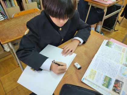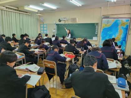 大都市圏周辺の農業について学習しています。ノート書くときはすごい勢いで書きます。説明を聞くときはしっかりと聞いています。