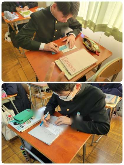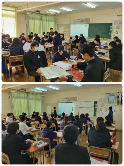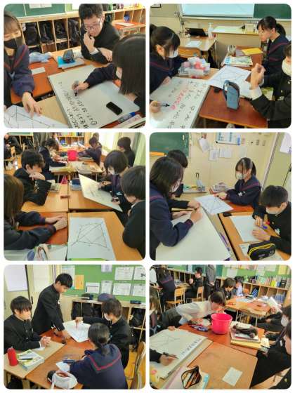 中点連結定理を利用した証明の課題に取り組んでいます。個人で考えた後、班で共有して証明を考えました。みなさん積極的に意見を交換していました。