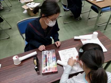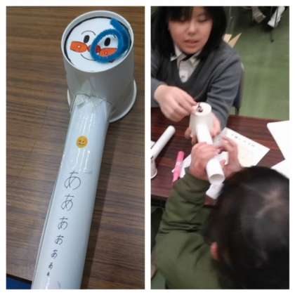?科学部のワークショップの様子です。筒に声を出しながら息を吹きかけるとモールで作ったヘビがが回りだす楽しいワークショップでした。参加してくださったみなさん、ありがとうございました。