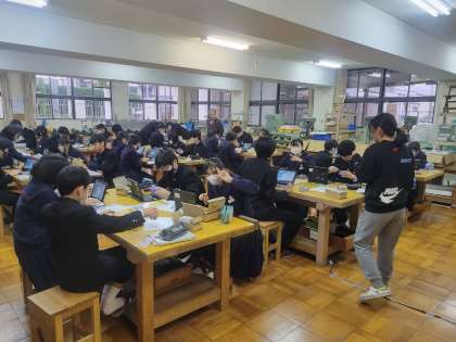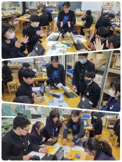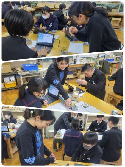 自分で組み立てた、プロロボを課題通りに動くようにプログラムを作ってロボットに転送して動かしています。課題通りにピッタリ到着すると拍手が起こります。