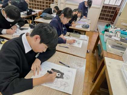 本日が2学期最後の美術の授業でした。習ったことをいかして中学校の思い出の1ページを最後まで工夫して頑張りました。