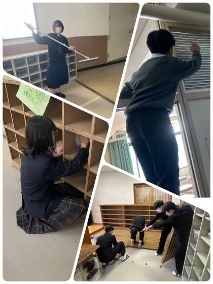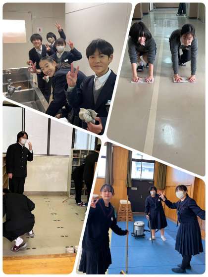 全員で学校中を掃除しました。いつもお世話になっている校舎に、感謝の気持ちを込めて掃除します。みなさんいい顔です。校舎も喜んでくれていると思います。