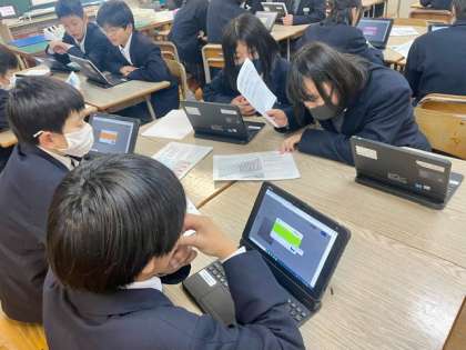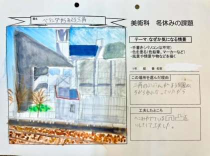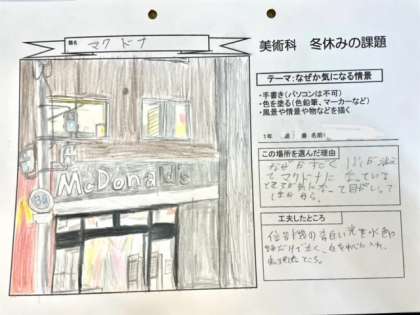 冬休みの宿題を相互鑑賞しました。テーマは「なぜか気になる情景」です。それぞれなぜ気になったのかと工夫したところを発表し、タブレットで意見を共有しました。