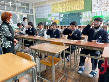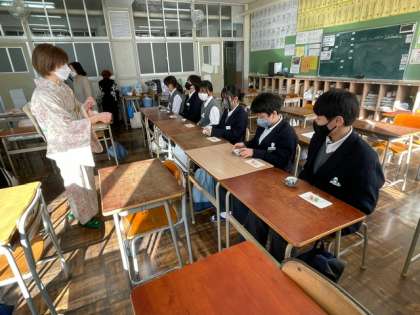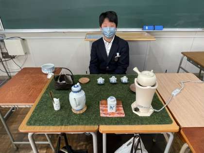 1年生は5、6時間目の時間に日本文化体験がありました。それぞれの講座に分かれて講師の方々にご指導いただきました。写真は「煎茶」の様子です。