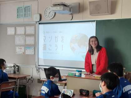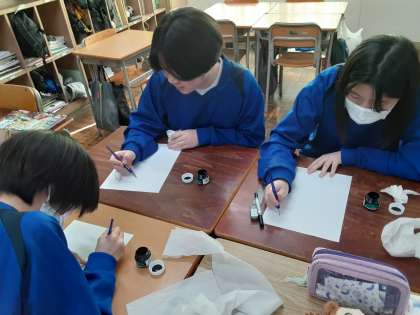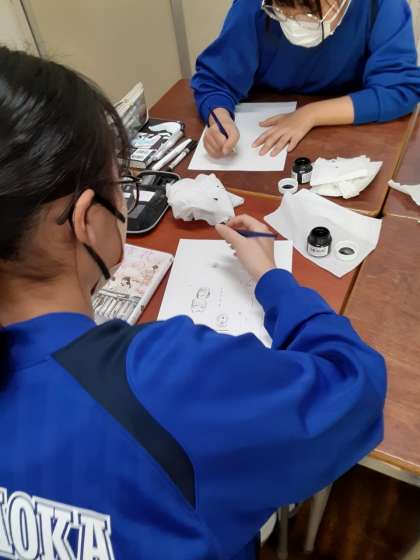 「漫画」の様子です。Gペンとインクを使って漫画を描きました。普段なかなか手にしないものなので、線が太くなったり細くなったりして苦戦しましたが、楽しめました。