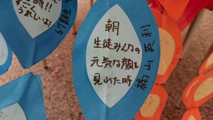 全校生徒と教職員の幸せと感じる時が一枚一枚の羽根に書かれています。
