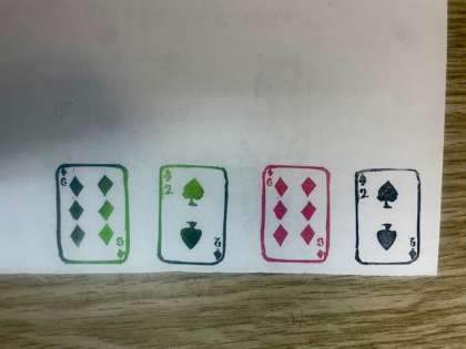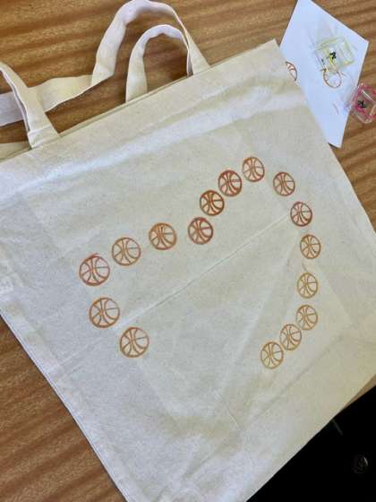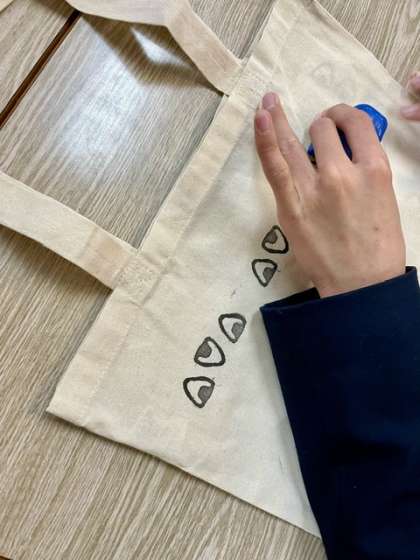 トートバッグに消しゴムハンコでスタンピングをしています。ためし押しをしてから、色ののせ方やハンコの向きを工夫し、トートバッグに押していきます。