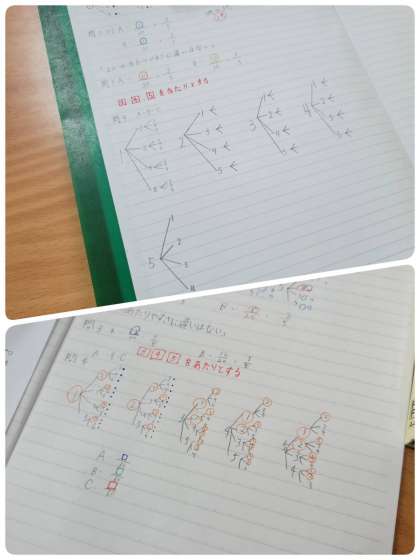 確率を学習しています。樹形図をかくのは少し大変ですが、意外と楽しいですし、大きいのをかいたときの達成感もありますね。