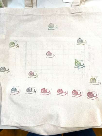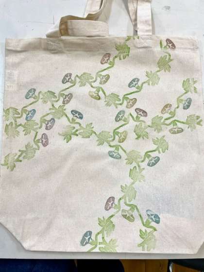 トートバッグに消しゴムハンコで連続模様をおしました。思いをこめた模様をどのように配置するか構成を考え、丁寧にハンコをおし、完成させることができました。