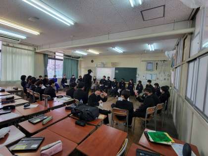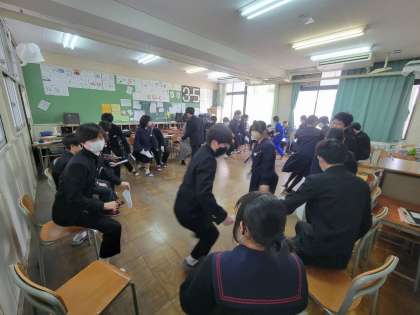 授業の後半で、英語を使ってフルーツバスケットをしました。中学校で習った様々な文法を使って指示を出します。楽しく英語を学びました。