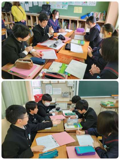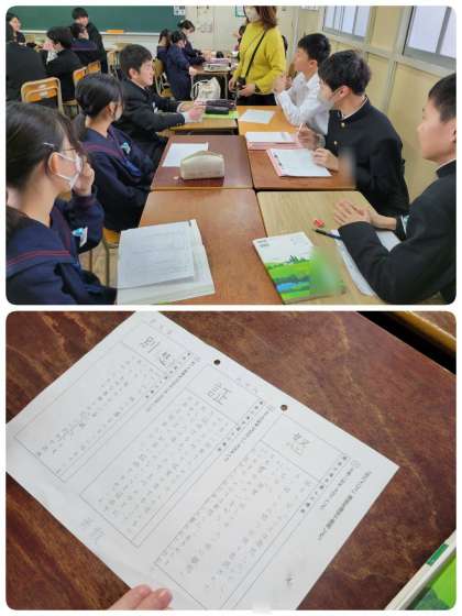 走れメロスの場面ごとに一つの漢字で表現して、班で発表しあいながらお互いの考えを共有しています。また、途中で班のメンバーがジグソーパズルの用に他の班のメンバーと入れ替わり、違う班の意見を聞いてきてさらに考えを深めました。
