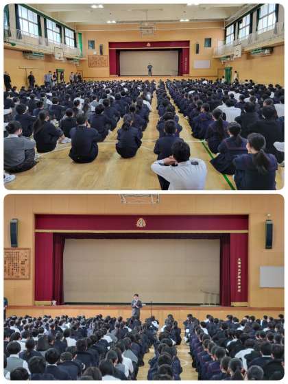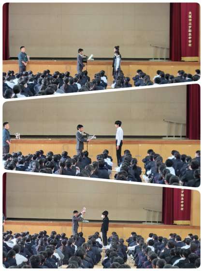 校長先生のお話の後、ソフトテニス部、陸上競技部、サッカー部の表彰がありました。みなさん、おめでとうございます。