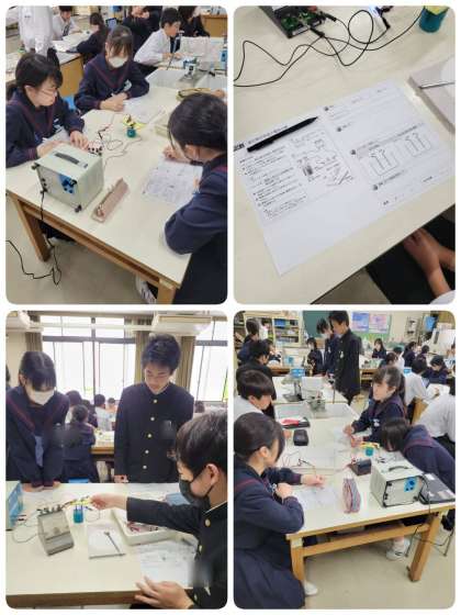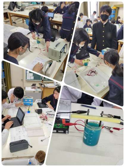 塩化銅の電気分解の実験をしています。さすが3年生で、手際よく準備して実験に取りかかっています。水溶液や電極の変化、発生した気体の臭いなどにも注意しながら、注意深く観察していました。