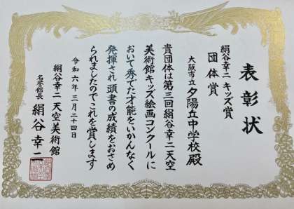 第三回絹谷幸二天空美術館キッズ絵画コンクールで団体賞を受賞しました。今まで個人での賞はありましたが、団体での賞は初めてです。おめでとうございます。