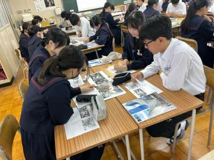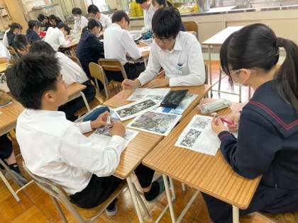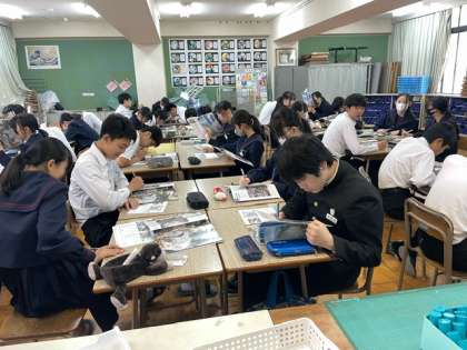 衝撃なできごと(戦争や地震)がきっかけとなり出来上がった作品から、作者が社会にうったえたいこととは何かを考えました。最後に社会における美術の役割を考え、発表しました。