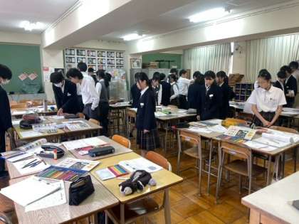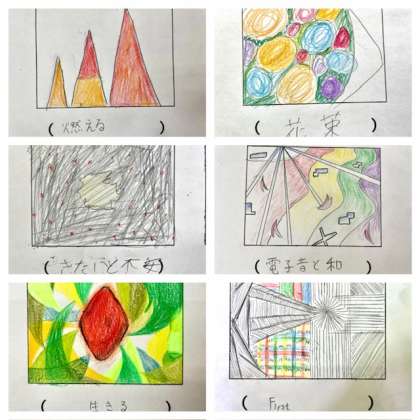 アイデアスケッチの相互鑑賞の様子です。1人ひとつ気になったアイデアを選びました。選ばれた作者はアイデアの線や形、色の意味などを発表しました。