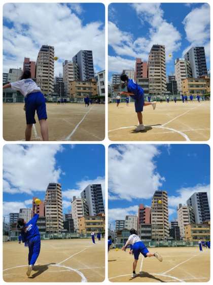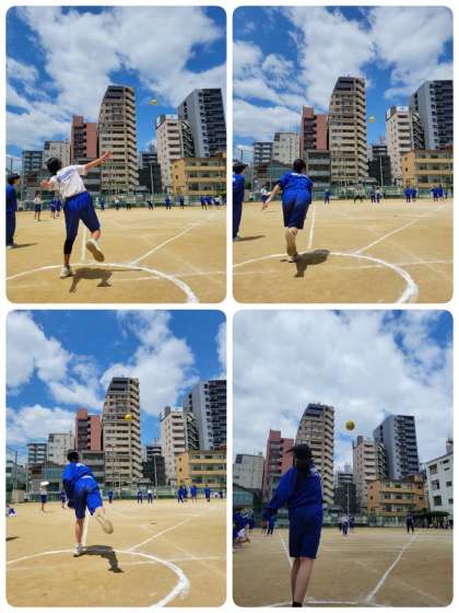 スポーツテストのハンドボール投げをしています。投げる人もそうですが、測る人や拾う人、記録する人など役割分担もしっかりできています。