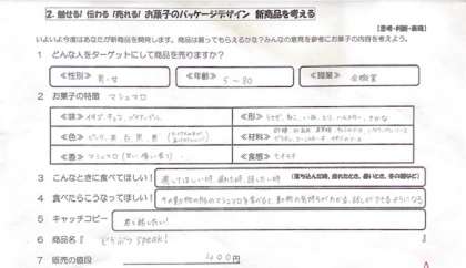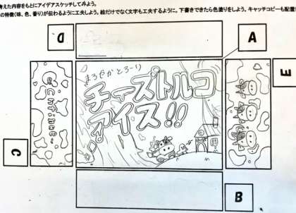前の時間で考えた新商品のアイデアスケッチを描いています。文字の字体や色、文字と絵の配置、構成などを工夫し、お客さんに伝わる、手にとってくれるデザインを目指します。