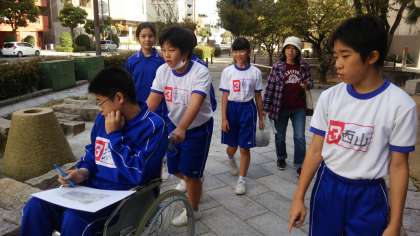 午後からは班に分かれて、校区内を車いすで移動しました。移動している中で町中にどのようなバリア(障壁)があるのかを調べました。各班が調べたものをもとに福祉マップを作成する予定です。