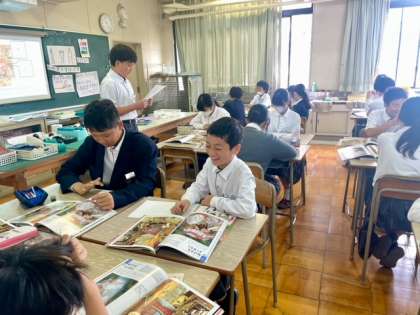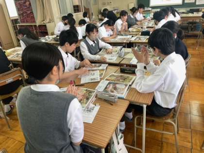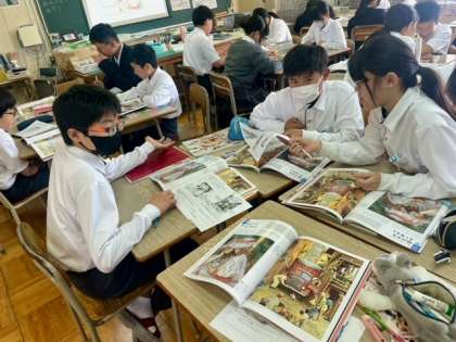 ルノワールの「読書する二人の少女」とロックウェルの「通行止め」の絵画鑑賞をしました。絵の中で聞こえてくる音や絵の中の温度、人物の関係性、作者が工夫した点などを話し合い、班で出てきた意見を全体に発表しました。色々な意見が出てとても盛り上がりました。