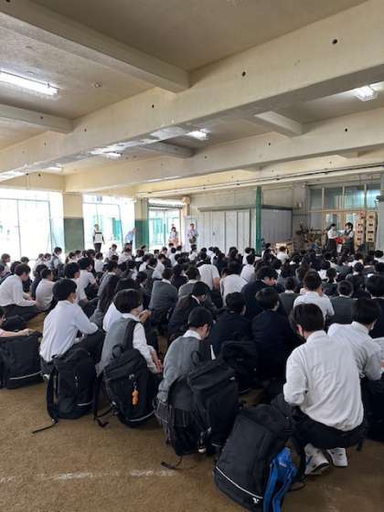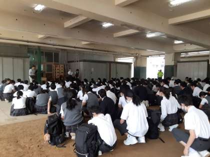 2年生は班で大阪市をまわります。出発式の様子です。心配していた雨は上がりました。スタートの時間になった班から順番に出発していきます。