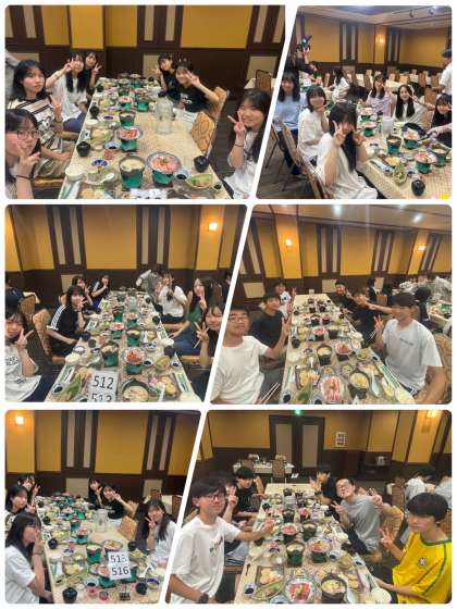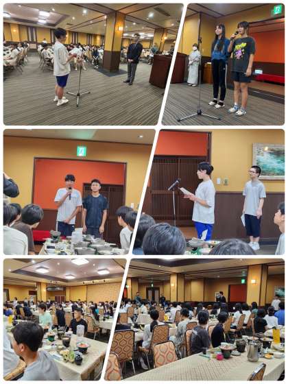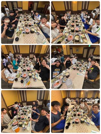 修学旅行1日目のアクティビティが終わり、お風呂を終えて、お腹ぺこぺこで、待ちに待った夕食でした!色々な種類があり、皆さん美味しそうに食べています。たくさんおかわりもして、お腹は満たされたようです。