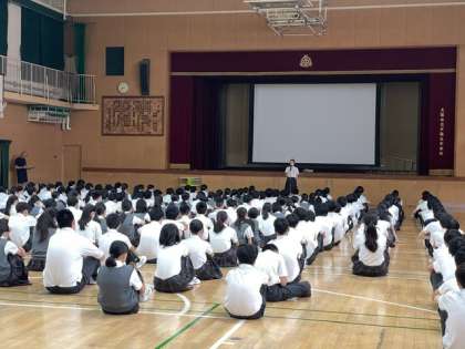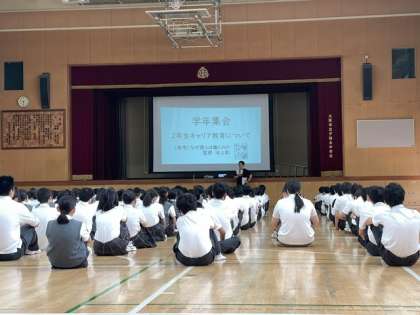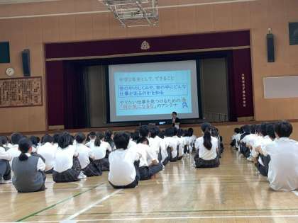 先生からなぜ働くのかについての話がありました。この1年間に取り組むキャリア教育を通して「仕事」について考えてみましょう。私達は誰かの仕事に支えられて生きています。世の中のしくみや世の中にどんな仕事があるのかを知っていきましょう。