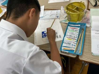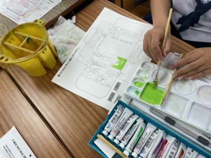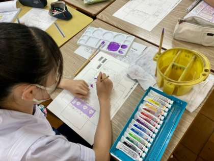 お菓子の箱の展開図に下書きを終え、ポスターカラーで着彩しています。全体のバランスを考えながら、効率よく塗っていきます。