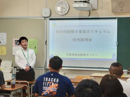 総合教育センターより、讃井先生にお越しいただき、2学期から行う予定の総合的読解力育成カリキュラムの研修会を行いました。