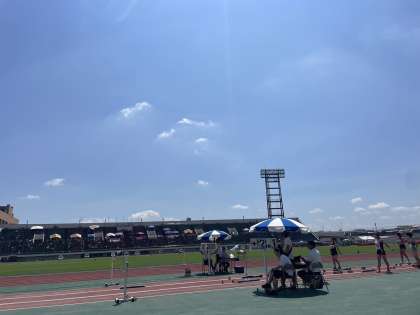 昨日に引き続き現在35℃と厳しい暑さですが、女子ハードルでは2名が自己ベスト、1名が予選通過を決めています。女子砲丸投も予選通過を決め、女子幅跳びでも自己ベスト更新者が出ており順調な滑り出しです。