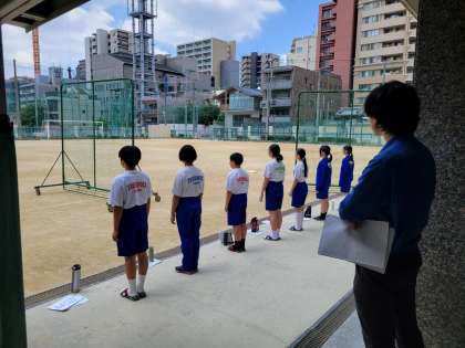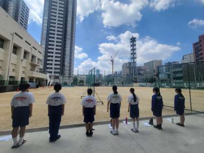来週のコンクールに向けて、いつも真剣に練習しています。このときはグラウンドに向かって練習していました。少ない人数ですが、工事の音にも負けず、綺麗な歌声がグラウンドに響き渡ってました!