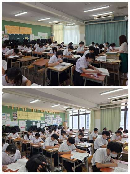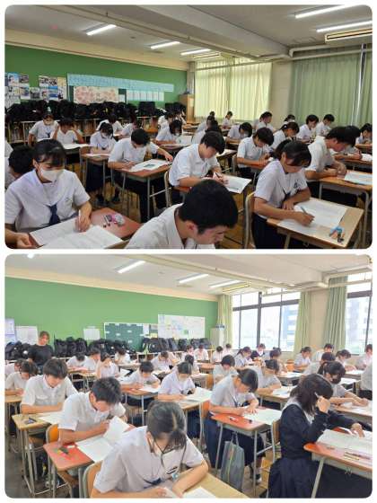 3年生は、国語、社会、数学、理科、英語の順にテストを受けています。いつもどおり、みなさんがんばっています。