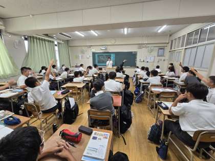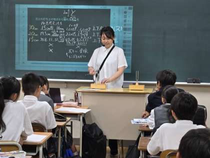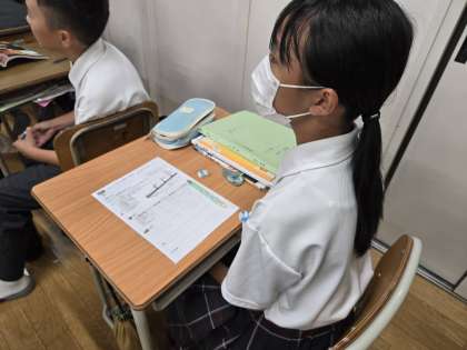 音の伝わり方について学習しています。音叉を2つ並べ、片方の音叉をたたいたあと、音叉を止めても、たたいてない方の音叉はなり続けます。