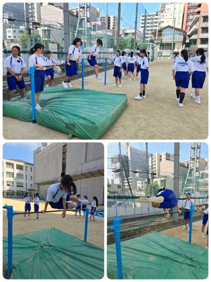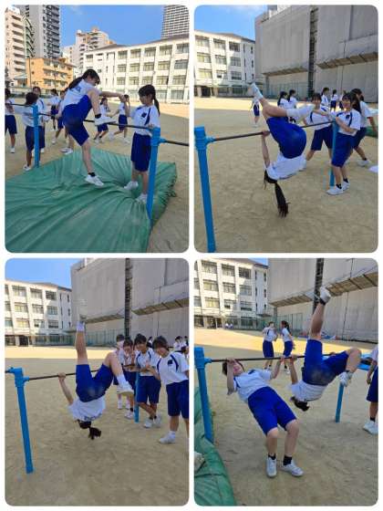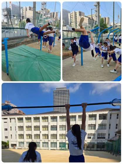 鉄棒を学習しています。苦戦している人も多いですが、難しい技に挑戦している人もいます。