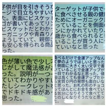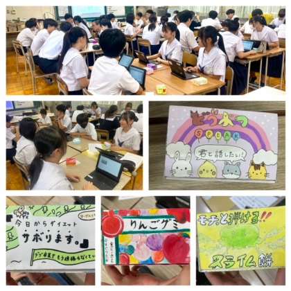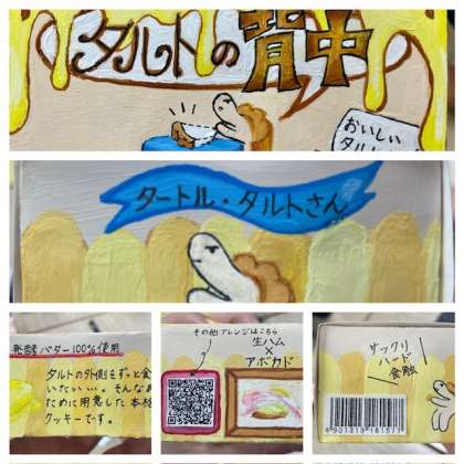 3年生は完成したお菓子のパッケージデザインの相互鑑賞をしました。味や形、食感などを伝えるために色や文字のかたち、構成で工夫したところを発表し、その作品を見て感じたことを共有しました。細かい部分が多く、絵の具に苦戦した人も多かったですが、とても素晴らしい作品ができました。おつかれさまでした。