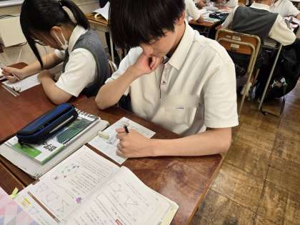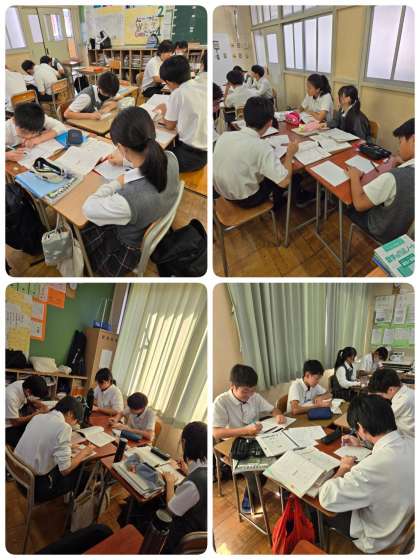 角度を求める問題を、様々な方法でアプローチして解いています。班で話し合うと新しいアイデアが出てきたりしますね。