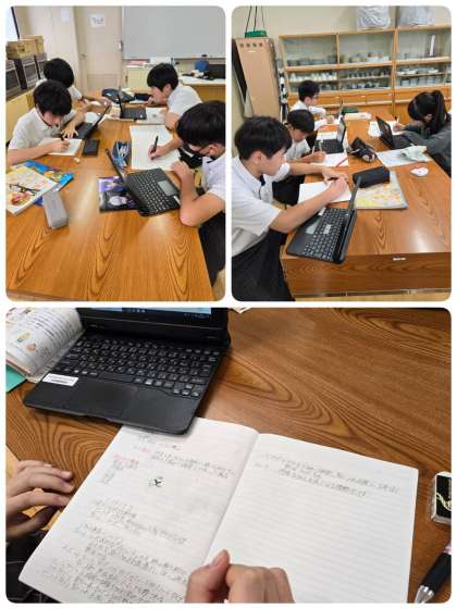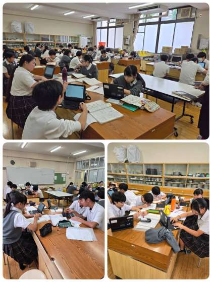 タブレットをつかって、いろいろな国の伝統的な加工食品を調べて、ノートにまとめています。