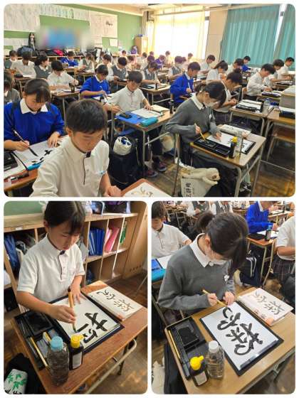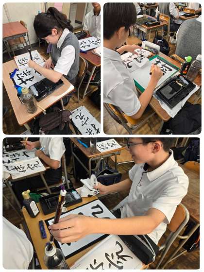 書道に取り組んでいます。「探求」の作品を仕上げています。