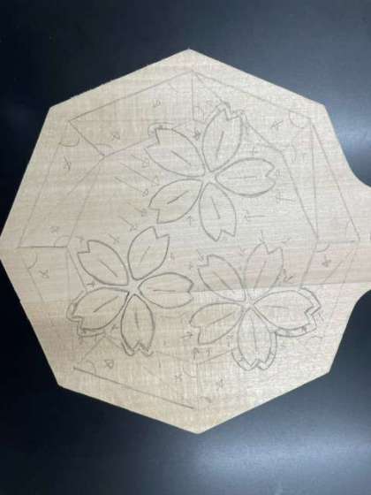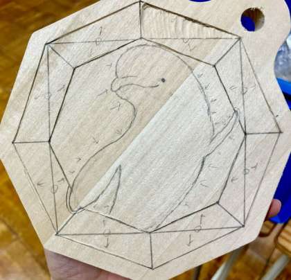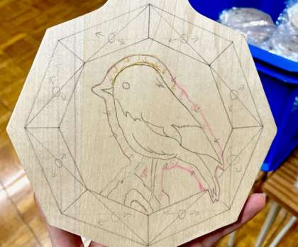 前の時間にデザインしたアイデアを板に転写しました。写したあとは彫りの計画を立てます。次の時間からはどんどん彫っていくので、ケガのないように注意しながら頑張りましょう。