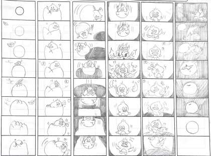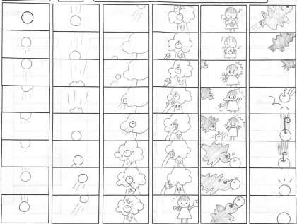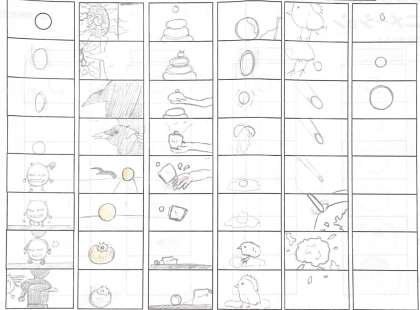 ◯からはじまり◯で終わるアニメーションの絵コンテを考えています。シンプルな線の中にしっかりストーリーがつまっています。次の時間に紙にそれぞれ描き、1枚ずつ撮影してつなげていきます。