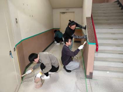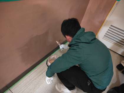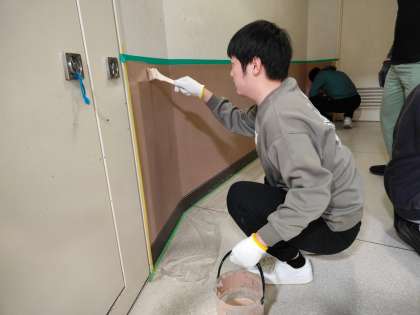 夕陽丘中学ではペンキ塗りの体験をしていました。指示を聞きながら綺麗に塗れるように頑張りました。