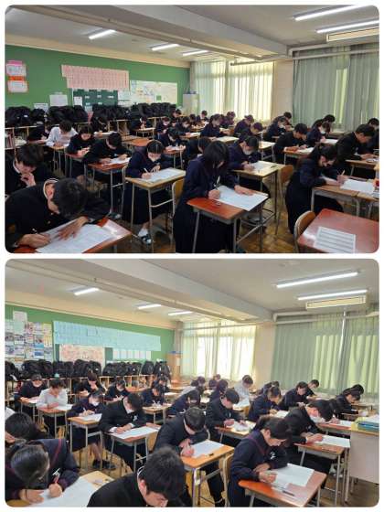 3年生は、国語、社会、音楽のテストを受けました。明日もがんばりましょう。
