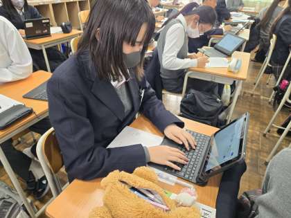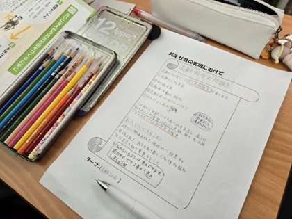 共生社会の実現に向けてというテーマで調べて、複数の情報を活用し、1枚の用紙にまとめを作っています。これはこれから大切になる力ですね。