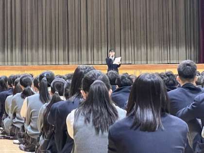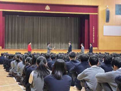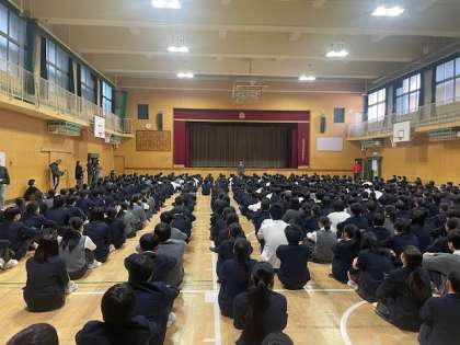 期末テストが返ってきていると思います。ふり返りをして次につなげましょう。12/4〜12/10は人権週間です。一人一人安全に自分らしく生活することが大事です。お互いを認め合いながら気持ちよく過ごせるにはどうすればいいのか考えてみましょう。最後にバドミントン部の表彰と図書委員会から冬休みの貸し出しについての連絡がありました。