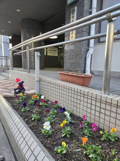 正門前の花壇に、グリーナリー天王寺さんからお譲りいただいた花を管理作業員さんが植えてくださいました。正門が華やかになり、夕吉も嬉そうです。