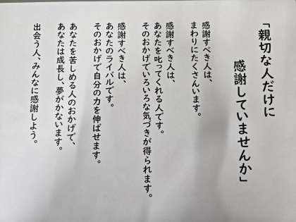 階段のおどりばに掲示してある「親切な人にだけ感謝していませんか」の言葉から引用して、叱ってもらった人への感謝についてのお話でした。
