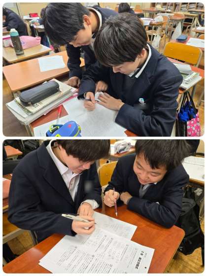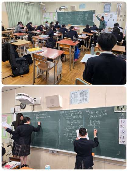 分割授業で、連立方程式の復習をしています。難しい問題は、友だちと協力して取り組んでいます。