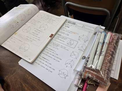 円周角の定理を学習しています。定理はシンプルてすが、応用問題は難しくなりがちな範囲ですね。