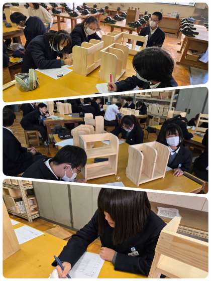 木材加工で制作した本棚が完成し、今日は相互鑑賞を行いました。