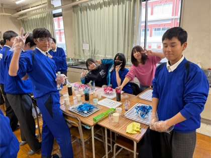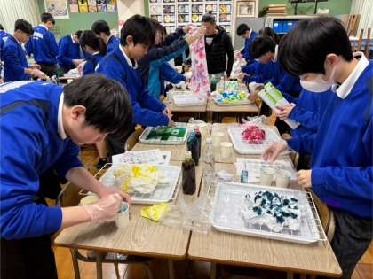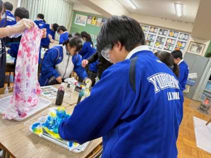 2年4組のTシャツ染めの様子です。好きな色に染めています。大変ですが、時間内に染めることができました。先生たちも自分のTシャツを染めにきてくれています。